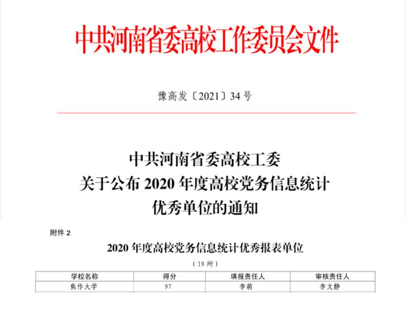 近日,中共河南省委高校工作委员会印发了《关于公布2020年度高校党务信息统计优秀单位的通知》(豫高发〔2021〕34号),对2020年全省高校党务信息统计工作相关情况进行表扬和通报。中共河南省委高校工作委员会通过对2020年度党务信息统计报表进行审核,并依据审核细则进行量化评比,全省共评出优秀报表单位19所,我校荣获“河南省高校党务信息统计优秀报表单位”荣誉称号。
