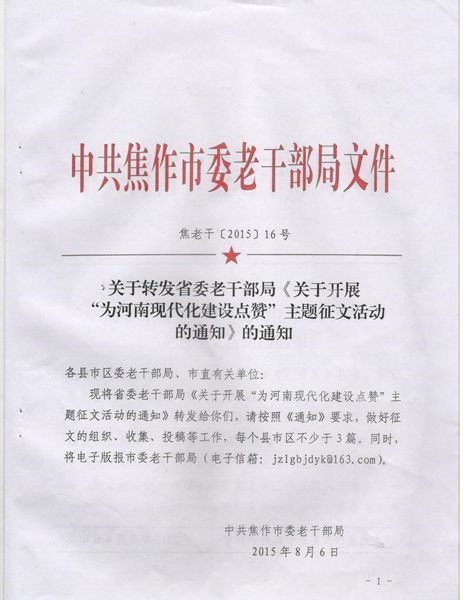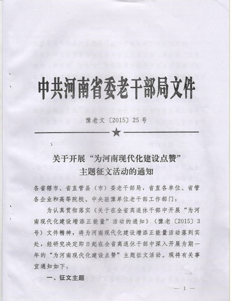 关于转发省委老干部局《关于开展“为河南现代化建设点赞”主题征文活动的通知》的通知